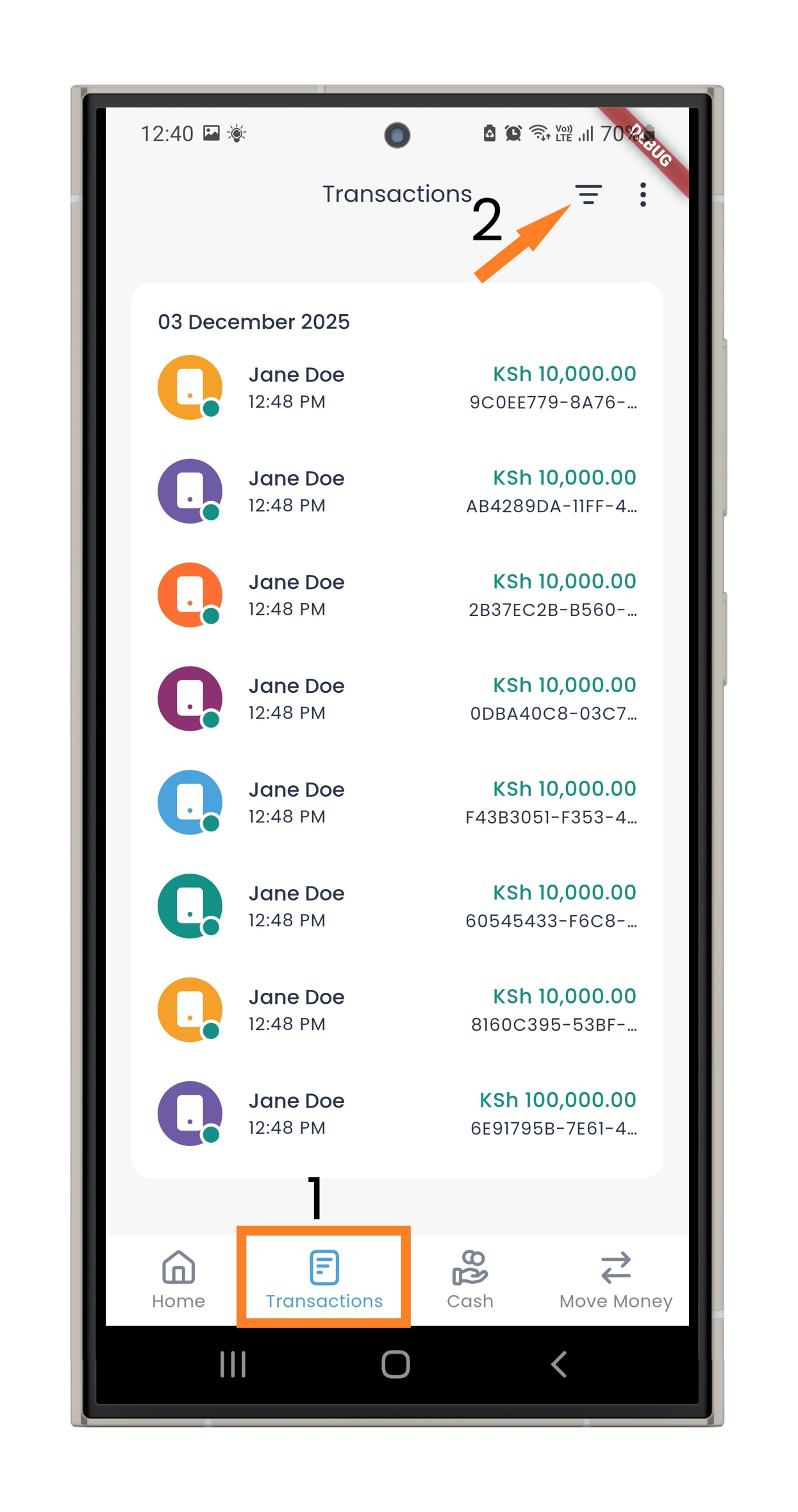 2: View all your current transactions. Click on the filter icon to select specific dates or types of transactions.