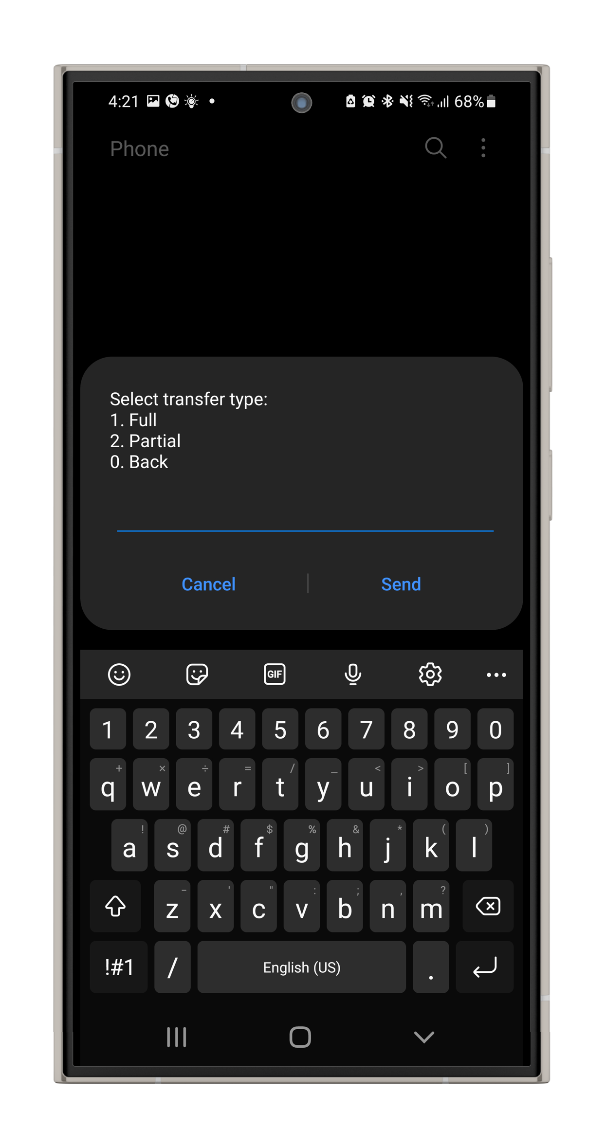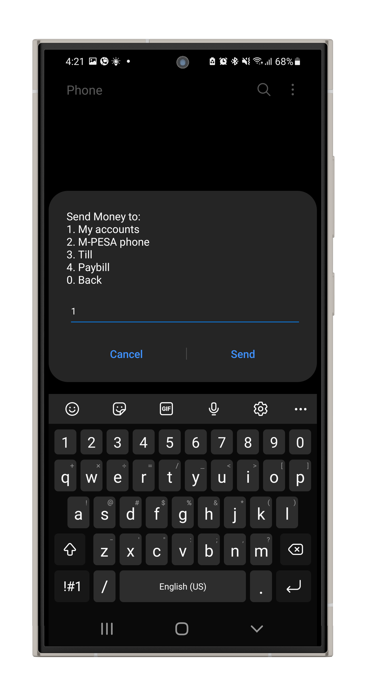 1: Dial *681# and choose option 2 (Send Money).