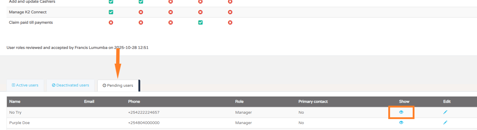 Scroll down and open the Pending users section.