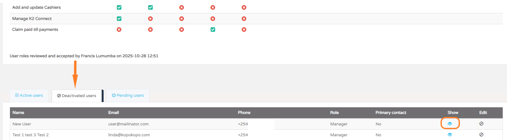 Find the user you want to restore and tap the eye icon to view their details.